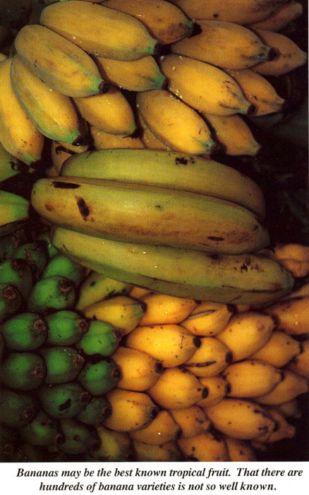These two fruit are similar in many respects. They are treated together and unless otherwise indicated, both the introduction and the recipes for one fruit can be substituted for the other. As a rule, plantains are better cooked and bananas better eaten raw. The plantain and banana are descendants of wild, seeded varieties. Both of these originated in Malaysia, but the banana was transported as early as the 5th century to Madagascar, and then elsewhere. Other species of wild bananas, usually full of seeds, appear to be native to tropical rainforests on several continents.