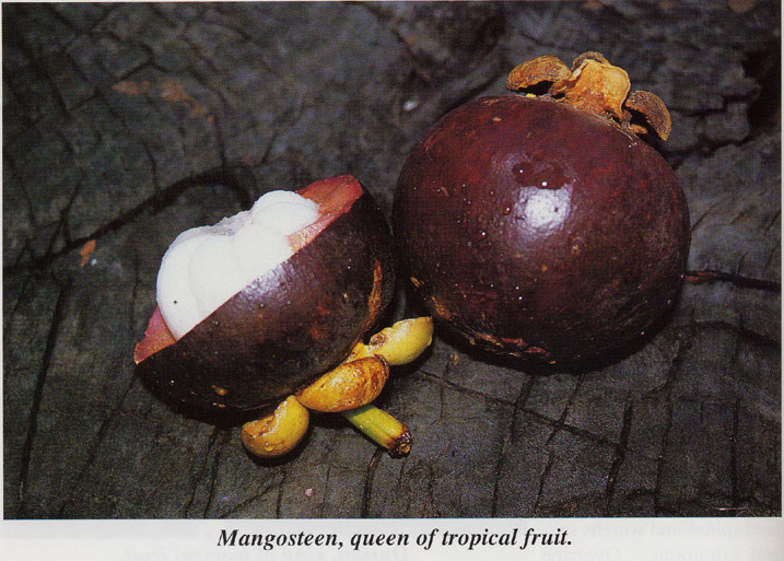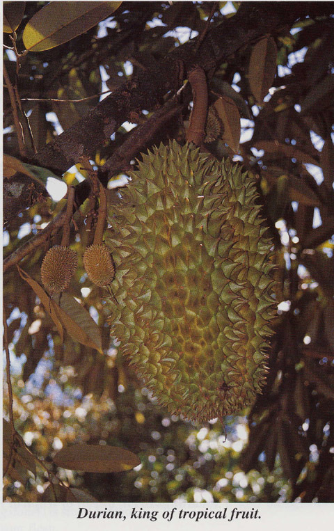 These two fruit, though quite unrelated, are regarded as the King and Queen of all tropical fruit. Few would fault the (purple) mangosteen (Garcinia mangostana), except that the rind leaves an indelible stain. Not so the durian (Durio zibethinus). Lovers of the fruit have mortgaged their possessions to gorge themselves. Others loathe the durian. Doctor Paludanus commented that “…it seems at first to smell like rotten onions…”. Linschott (1599) in reporting
